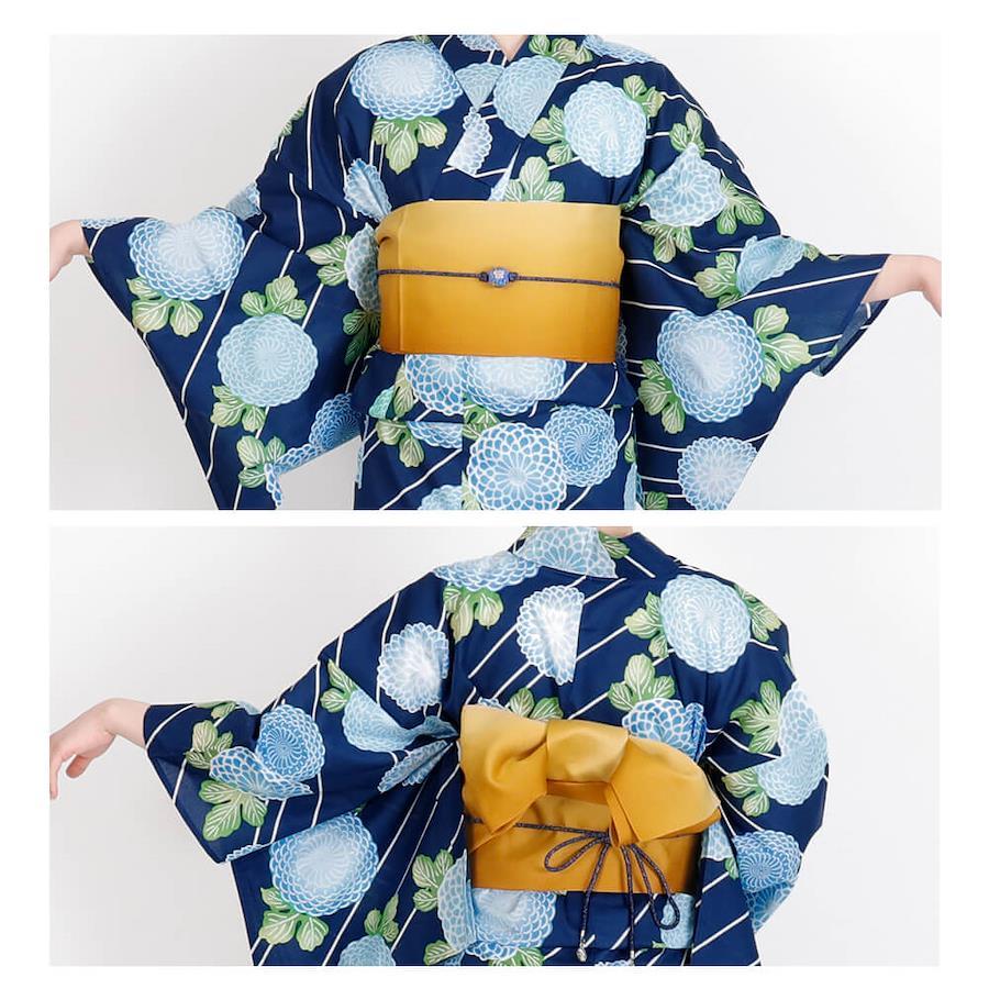 生地には綿100%を使用しており、シャリっとした爽やかな肌ざわりが特徴。ほどよい厚みで形が整いやすく、涼しさを保ちながらもきちんと感を演出できます。風が通りやすく、長時間着ていても快適な着心地。浴衣初心者さんにも安心の仕立て上がりタイプで、届いたらすぐに使えます。