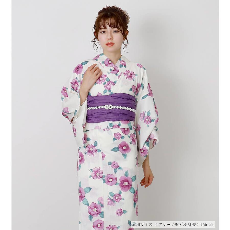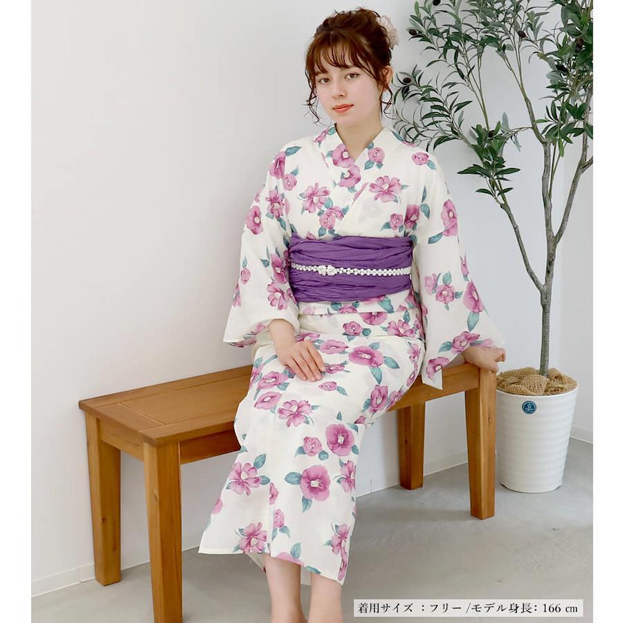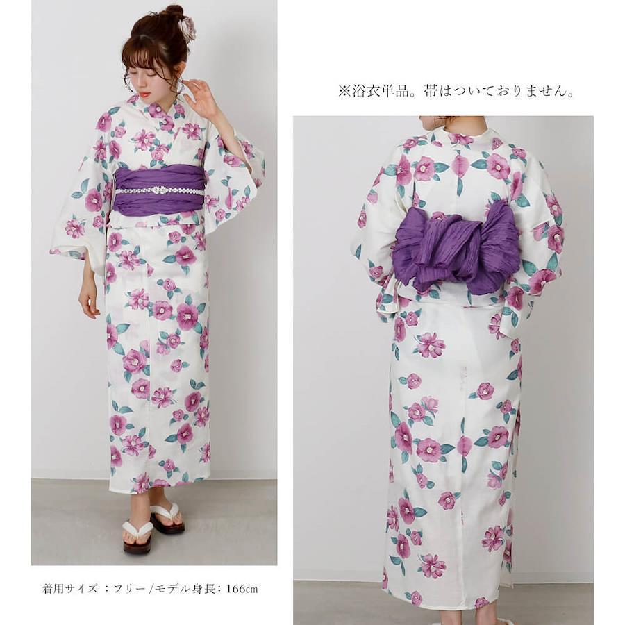 仕立て上がりタイプなので、届いたその日から着られるのも嬉しいポイント。着丈163cmで、身長160cm前後の方にちょうど良く、幅広い体型にフィットするフリーサイズ設計です。シンプルでいて華のあるデザインなので、夏祭りや浴衣デート、夕涼みのお出かけにもぴったり。花柄が好きな方や、初めて浴衣を選ぶ方にもおすすめの一枚です。