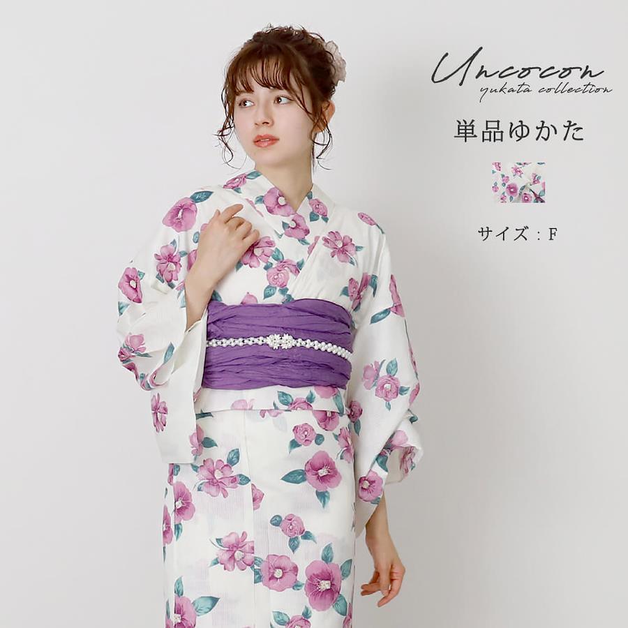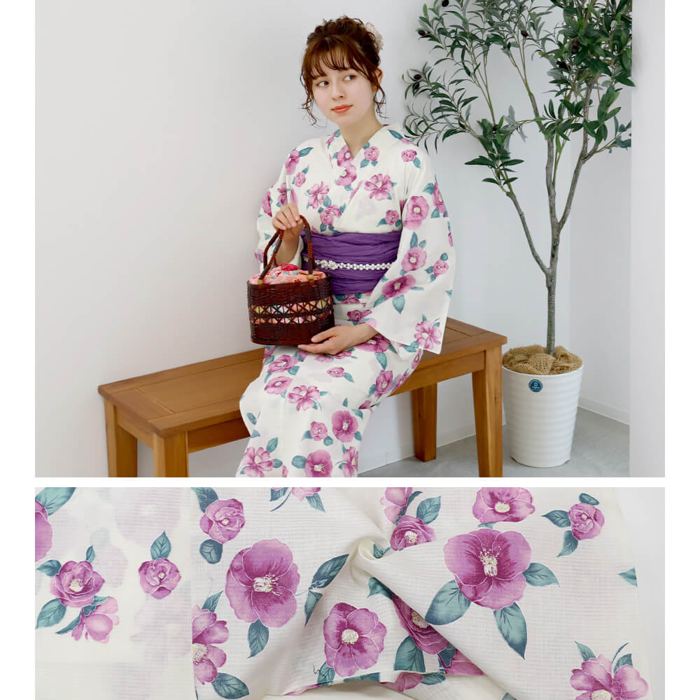 「若紫の椿咲き」は、白地に咲く優しい紫の椿が印象的な上品な浴衣です。派手すぎず、でもしっかりと華やかさがあり、大人の女性にぴったり。帯に合わせて印象を変えられるので、カジュアルにもフォーマルにも楽しめます。