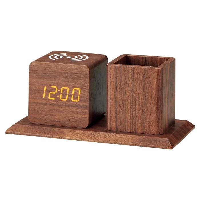 時計、アラーム、スヌーズ、カウントダウンタイマー、カレンダー、温度計、ペン立て、8×8×9.5cm