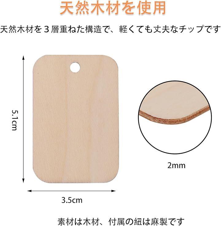 「商品仕様」サイズは5.1cm x 3.5cm、素材は木材、付属の紐は麻製です。