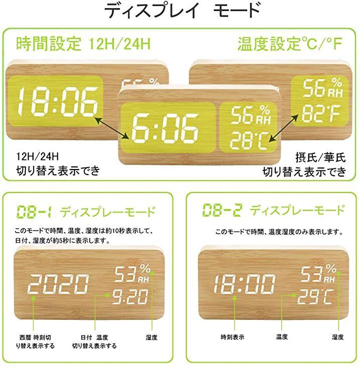 サイズ:15x7x4CM2020最新デザイン 目覚まし時計置き時計木目LEDデジタル時計アラームクロック温度湿度計カレンダー音声感知USB/乾電池給電