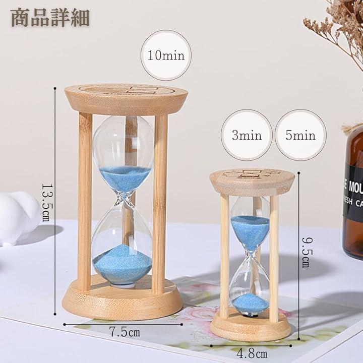 「サイズ」3分・5分:直径4.8cm /高さ9.5cm 10分:直径7.5/高さ13.5cm 「材質」木材、ガラス 「カラー」ブルー、イエロー