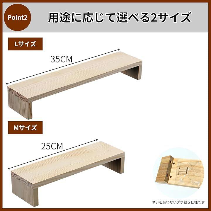 設置スペースや飾りたい物の大きさに応じて選べる、幅25cmのMサイズと幅35cmのLサイズの2種類をご用意しました。