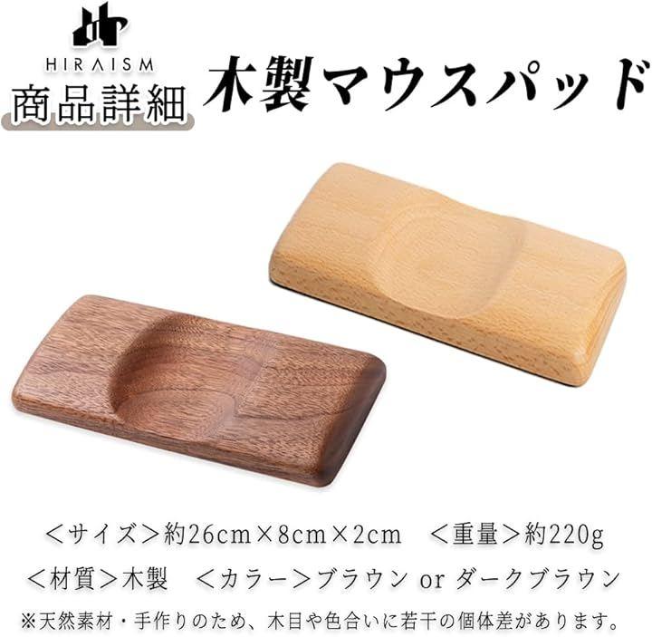 「商品仕様」木製マウスパッド <サイズ>約26cmx8cmx2cm <重量>約220g <材質>木製 <カラー>ブラウン or ダークブラウン