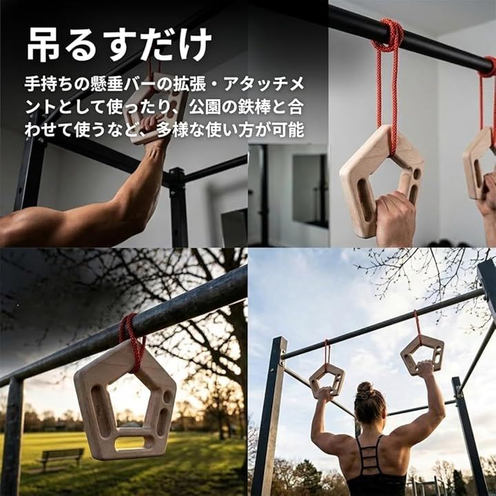 「吊るすだけ」ロープで吊り下げて使うスタイルだから、手持ちの懸垂バーの拡張・アタッチメントとして使ったり、公園の鉄棒と合わせて使うなど、多様な使い方が可能です。