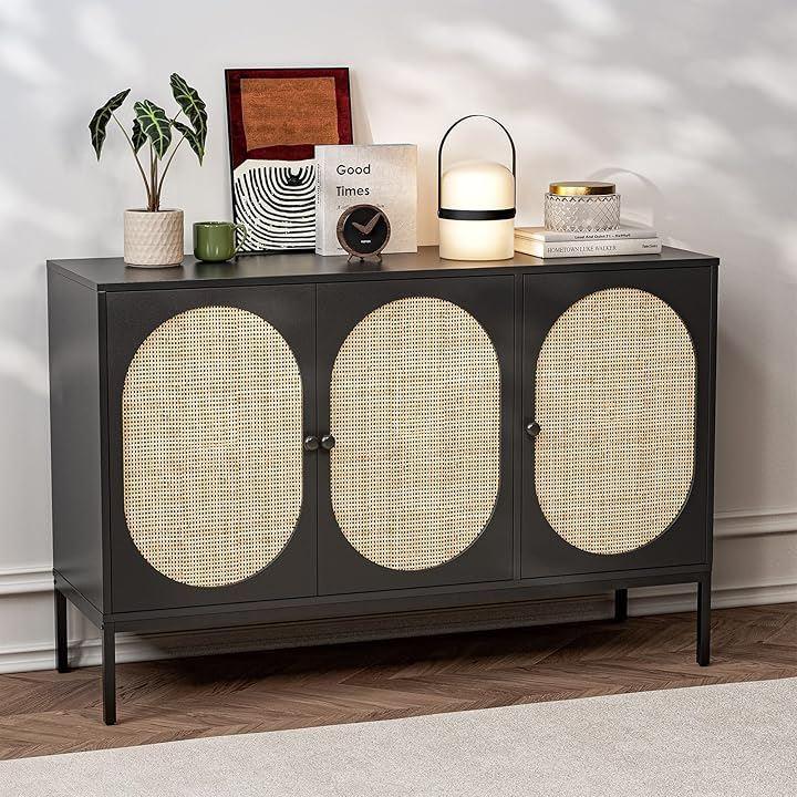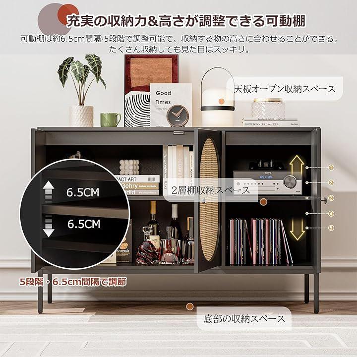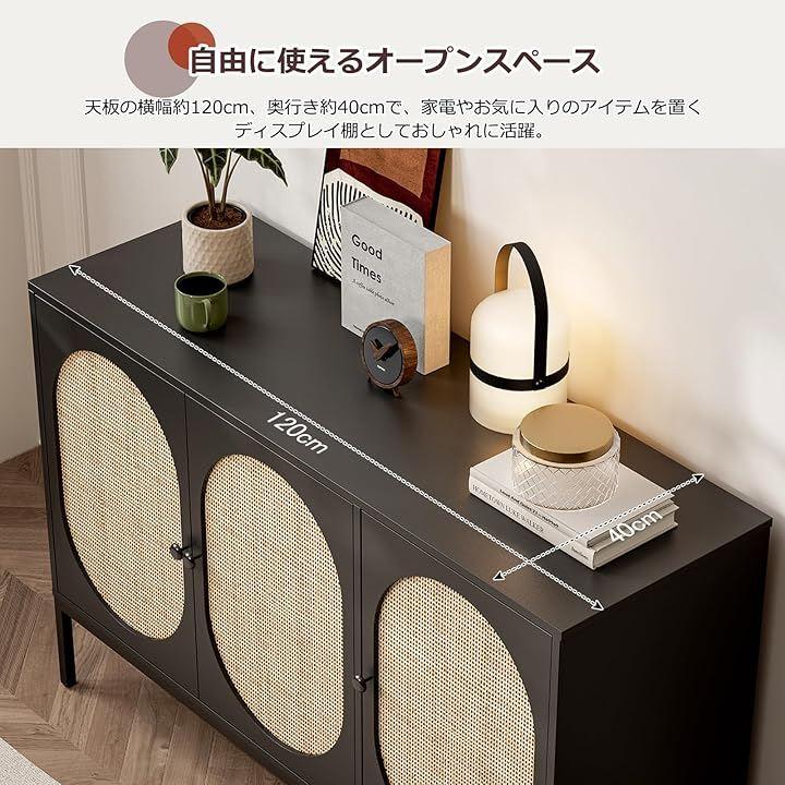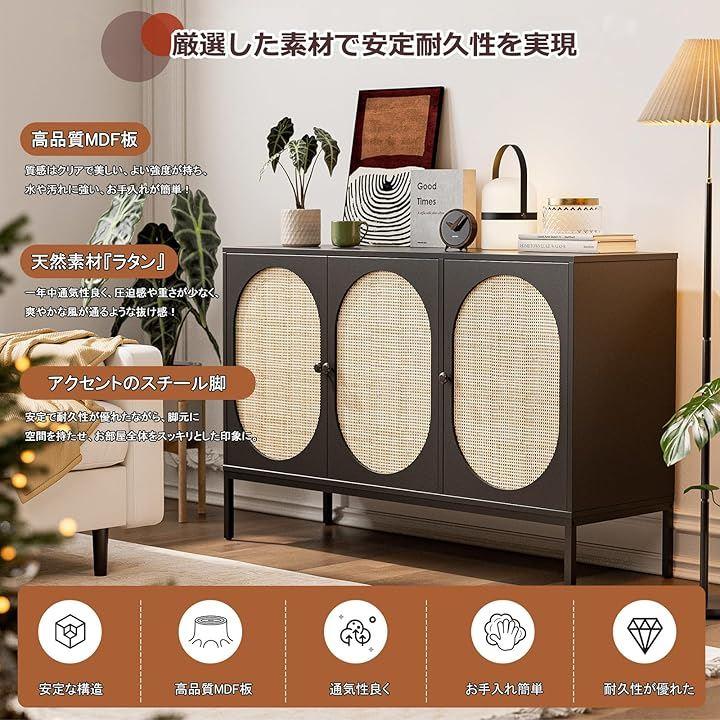 「天然素材ラタンおしゃれなキャビネット」サイドボードは天然ラタンと手織り技術で作られて、一面が木材の家具に比べて圧迫感や重さが少なく、爽やかな風が通るような抜け感を感じていただけます。