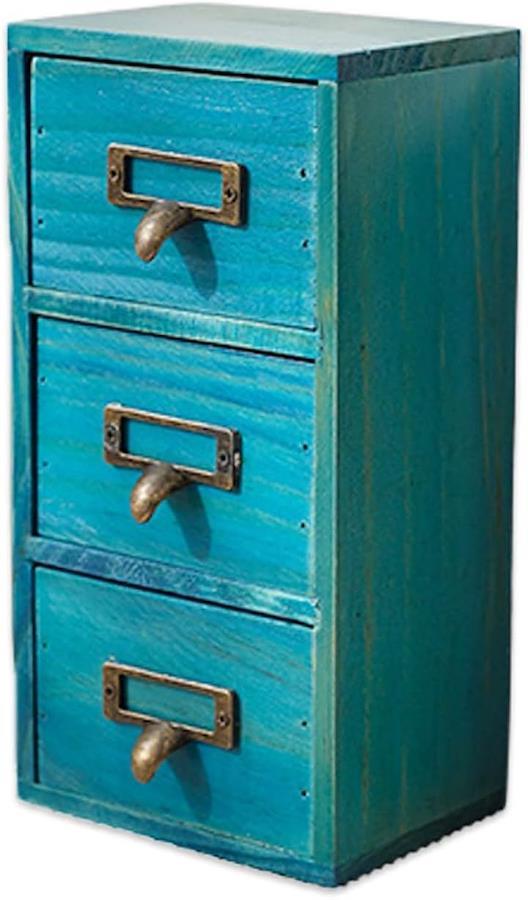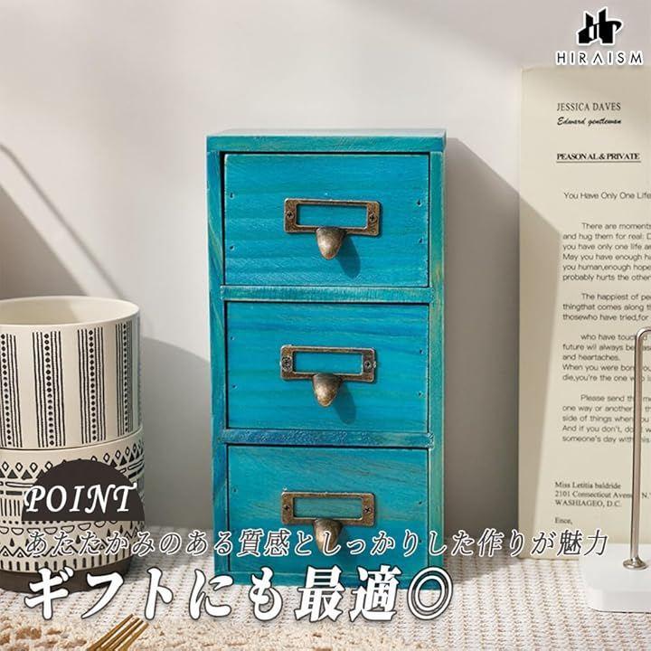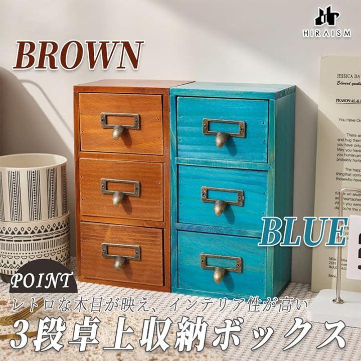 「商品仕様」3段卓上収納ボックス<サイズ>外寸:約29.5x18.5x17cm 引き出し内寸:約25x15x4cm(1段あたり) <重量>約1.8kg <カラー>レトロブラウン or ナチュラルブルー
