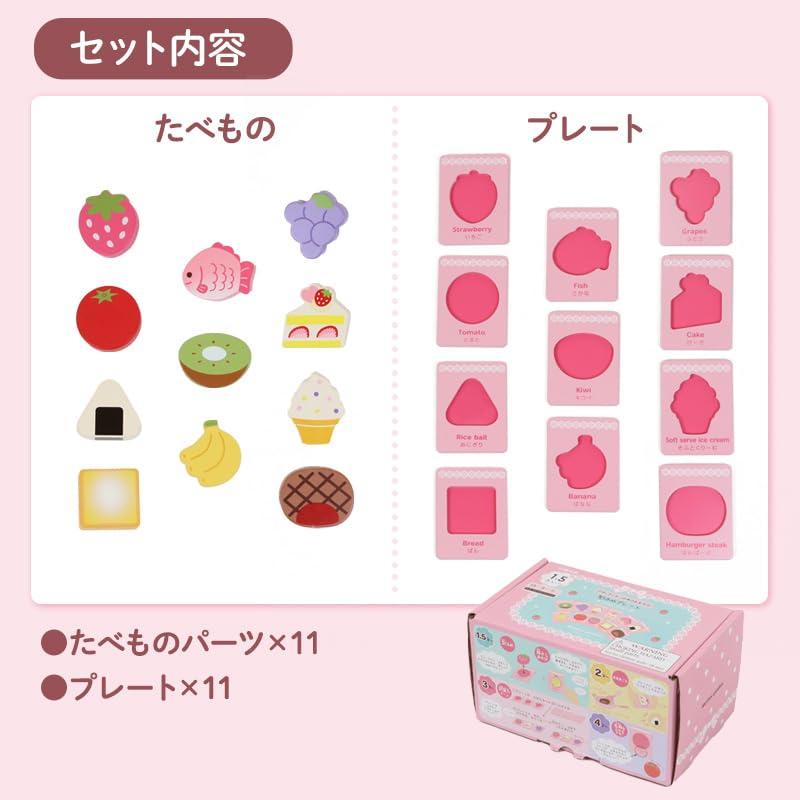 通常1-5営業日で発送:ご出産のプレゼントとしてお選びいただけるマザーガーデンの1.5才からお使いいただける木製おもちゃ 型はめ遊びだけでなく、成長に合わせた遊び方のアイデアがいっぱいの知育おもちゃです。 お子様にとって身近な食べ物パーツは、おままごととしても遊べます。 【安心】1.5才からのお子様に安心してお使いいただくため、かどが丸い作りになっています。 【塗料】この製品に使われている塗料は、日本の食品衛生法の試験に合格し安全基準を満たした、水溶性塗料を使用しています。お子様が舐めても安心してご使用していただきます。 【セット内容】 たべものパーツ(各1)/プレート(各1) ・いちご ・トマト ・おにぎり ・パン ・さかな ・キウイ ・バナナ ・ぶどう ・ケーキ ・ソフトクリーム ・ハンバーグ 【サイズ】 たべものパーツ:約4.5~5.5×4.2~5.5×厚み1.5cm プレート:約7×9.2cm 【素材】木製(天然木、MDF) 【塗料について】 日本の食品衛生法の試験に合格し、安全基準を満たしております。 水性塗料のため、ウェットティッシュなどを使用し、強くこすると色落ちする場合がございますので、ご注意