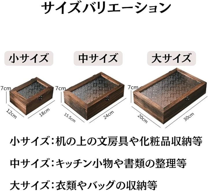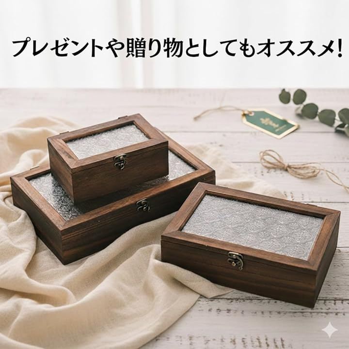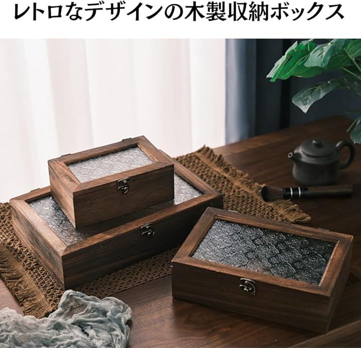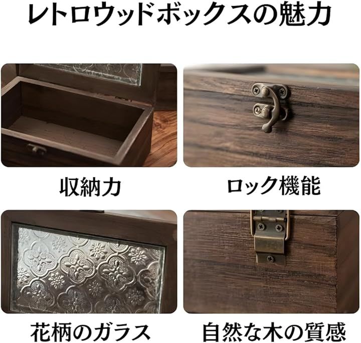 「時を越えて愛されるレトロな佇まい」 職人が一つひとつ丁寧に磨き上げた天然木のぬくもりと、懐かしい「海棠花」模様のパターンガラスが融合した、ノスタルジックな収納ボックスです 。