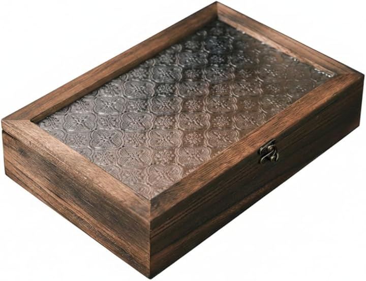 Wooden trinket box with lid, patterned glass, antique retro style, suitable for jewelry, tabletop storage, accessory organization, natural wood, amber color.