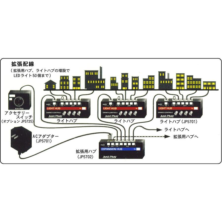 <使用方法>1. 「ACアダプター(品番JP5770)」または、「拡張ハブ(品番JP5702)」を本製品の「POWER-IN」コネクタに接続します。2. 「ライトハブ(品番JP5701)」を本製品の「HUB」コネクタに接続します。最大4個まで接続できます。ON/OFFスイッチを追加する場合3. 「アクセサリースイッチ(品番JP5725)」を本製品の「CTRL」コネクタに接続します。さらに拡張ハブを増やす場合4. 本製品の「POWER-OUT」コネクタと、その先の拡張ハブの「POWER-IN」コネクタを接続します。