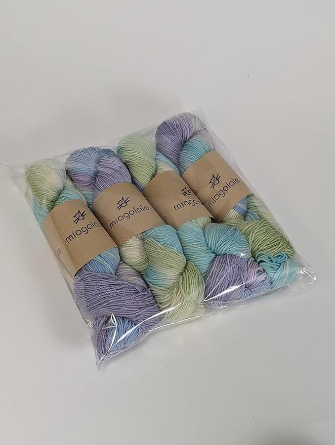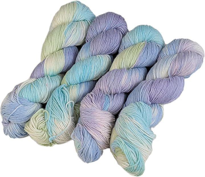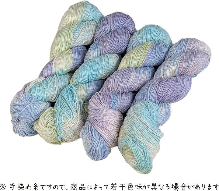 美しくナチュラルな色味をいくつか組み合わせて染めているので、1本の糸をどんどん編み進めるだけで、おしゃれなまだら模様があらわれる楽しい編み糸です。