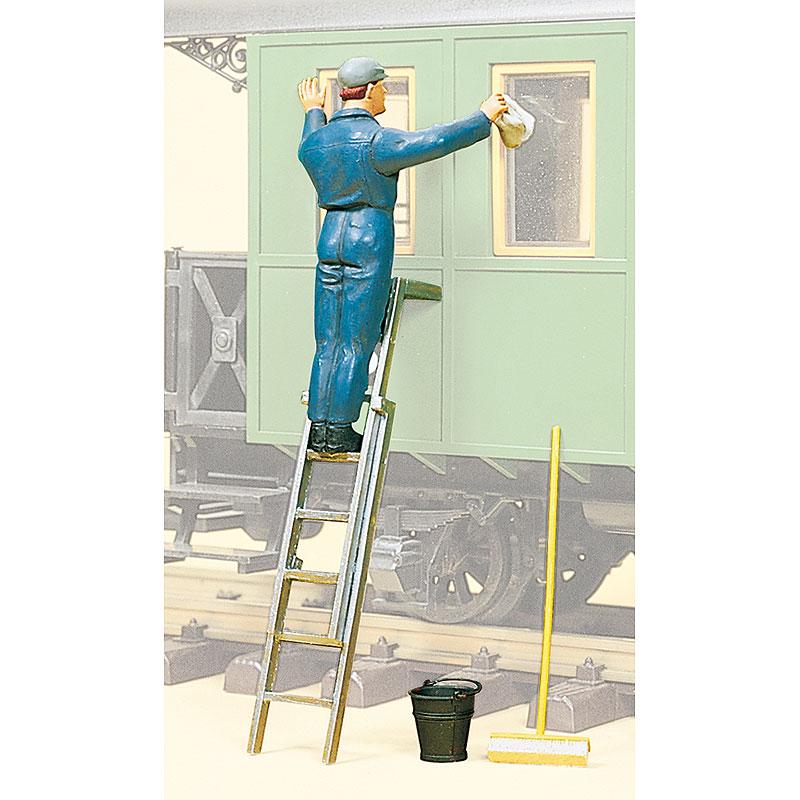 列車の窓を拭き掃除している作業員の人形です。