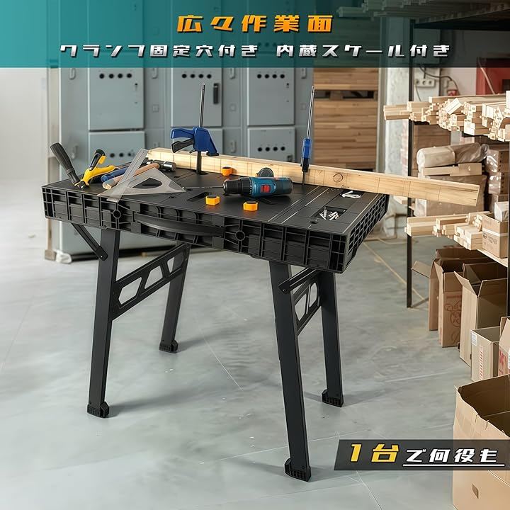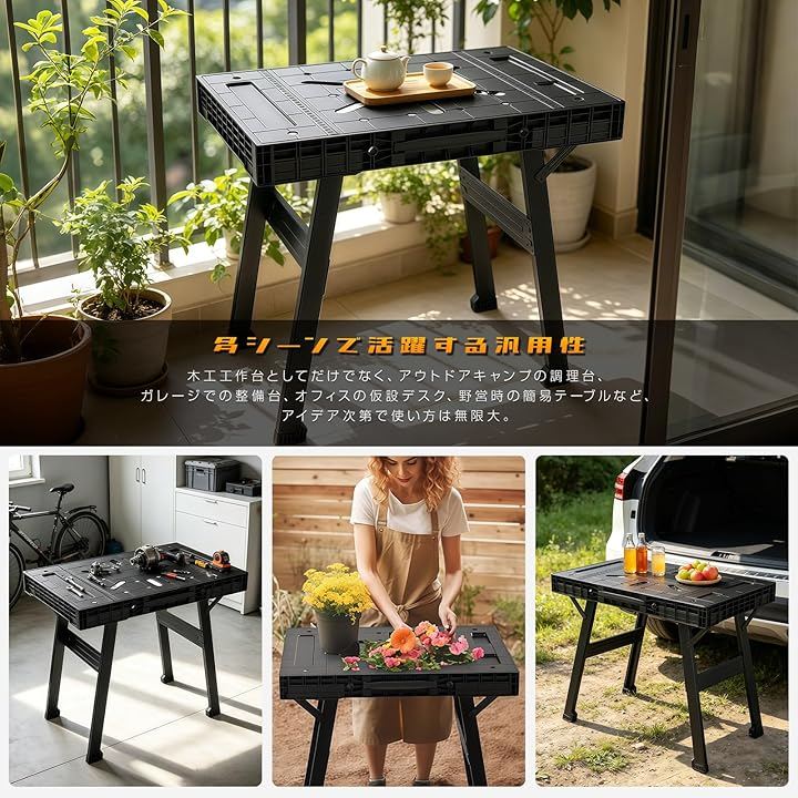 適用範囲:多様な用途,木工用作業台として木材のカットやテーブルの固定、ガーデニング用具の棚として。