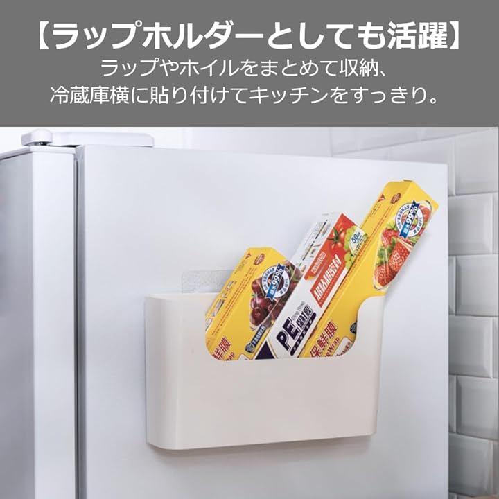 「ラップホルダーとしても活躍」ラップやホイルをまとめて収納、冷蔵庫横に貼り付けてキッチンをすっきり。