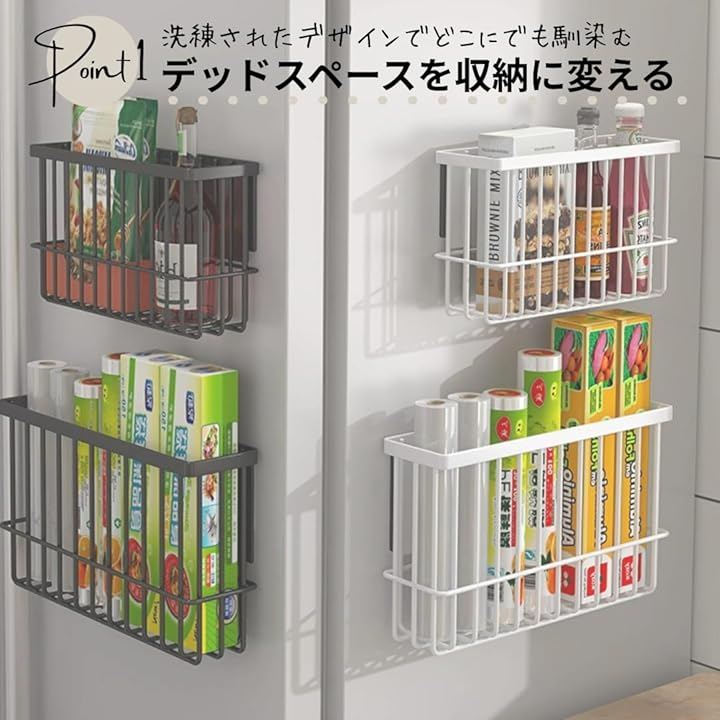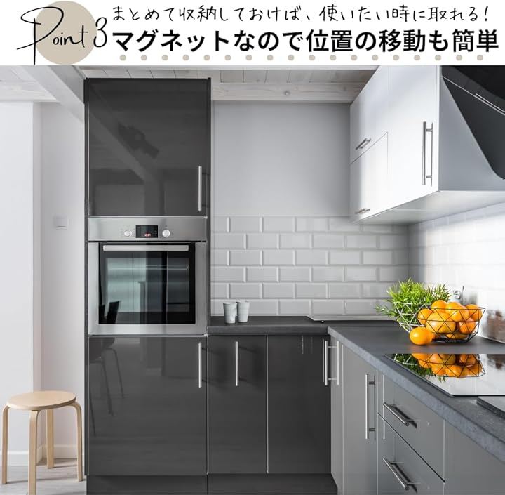 冷蔵庫横や壁に貼るだけで、すぐ手の届く便利な位置に収納。