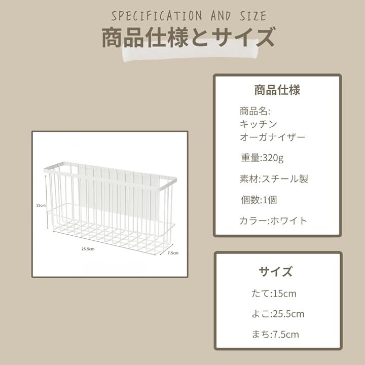 「商品仕様」商品名:キッチンオーガナイザー 重量:320g 素材:スチール製 個数:1個 サイズ:15cmx25.5cmx7.5cm カラー:ホワイト