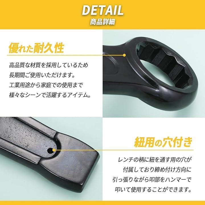 レンチの絵に紐を通す用の穴が開いているため、締め付け方向に引っ張りながら、ハンマーで叩いて使用することができます。