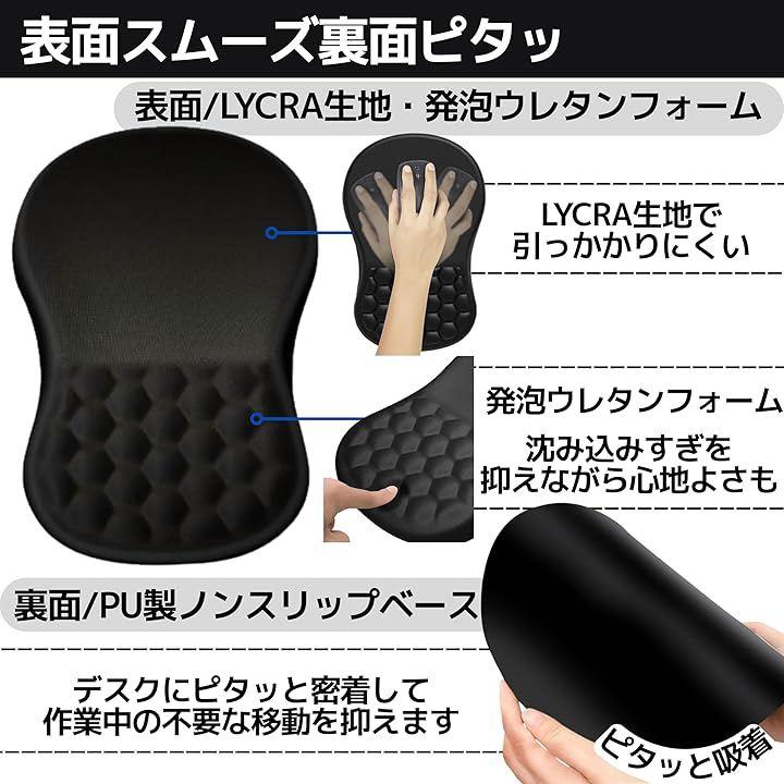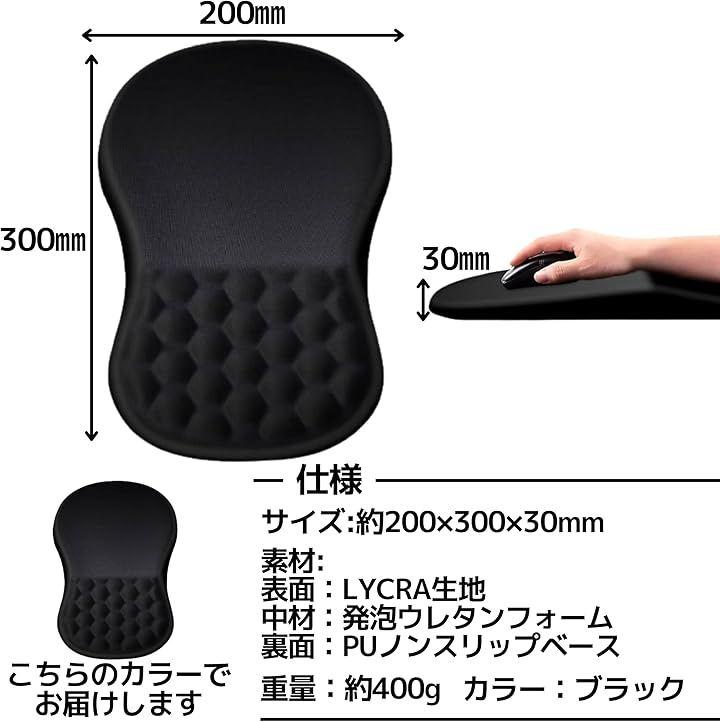 「仕様」 ・表面:LYCRA生地 ・中材:発泡ウレタンフォーム ・裏面:PUノンスリップベース ・カラー:ブラック ・サイズ:約200x300x30mm ・重量:約400g ・お手入れ:乾拭き・水拭き可(洗剤・つけ置き・高温乾燥は不可) 「仕様上の注意」 本品は一般的なパソコン用マウスパッドです。