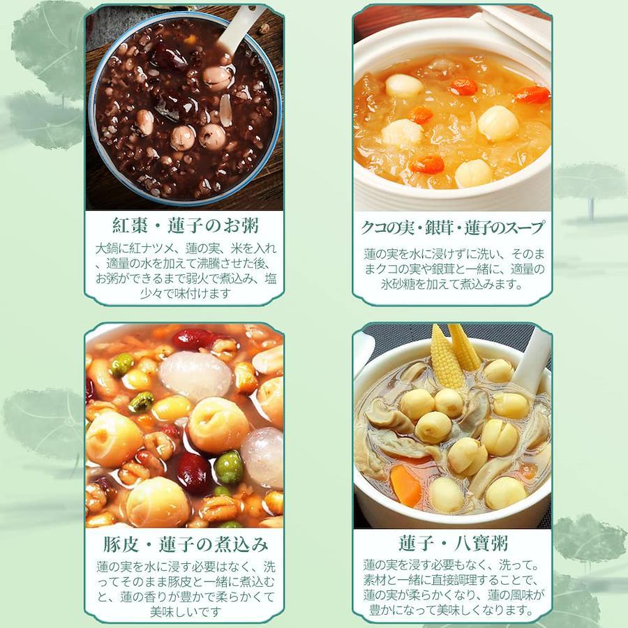 粒の大きい蓮子を人工的に精選し,芯率が高く,高品質にスクリーニングすることにより,蓮の子が放つ香りである。農家の手作り蓮工芸は機械工具を使わず、蓮の実を完全に保っている。新鮮に磨かれた蓮の実の表面には蓮の粉がたくさんあり、色が純粋で、煮たスープの方が香ばしく、蓮の香りがあふれ、食感がしっとりしていて、安心して食べられます。食べ方:良質のハスの実を乾燥させたものです。白米と一緒に炊飯してハスの実ごはん、炊き込みご飯に。鍋、スープ、煮込み料理、味噌汁の具材に。ちまきなどの中華食材、おかゆや茹でて蓮茶などの薬膳茶に。無添加。蓮の実は、栄養価が高く、でんぷん質が豊富で、栗のような食感や甘みがあります。ビタミンB1やカルシウム、カリウム、食物繊維が多く含まれおり、漢方にも使用され薬膳料理にも使われます。? 注意してください:包装表示の日付は製造日です。賞味期限:18ヶ月。食べ方:水を入れて飲むと、スープもいいです。貯蔵条件:密封、避光、防潮。【重要】メーカーによる商品リニューアルに伴いパッケージ(内容量も含む)変更が行われた場合、新パッケージでお届け致します事ご了承願います。