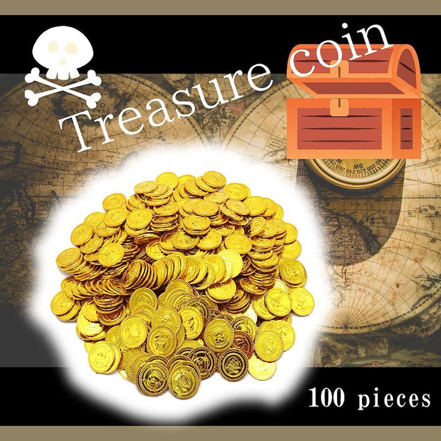 海賊ごっこに欠かせない 金貨 コイン 100枚セットです。 絵柄は宝箱と海賊ドクロ。コイン以外の物は付属しておりません。 海賊ごっこ、各種ゲームに。お遊戯会・舞台などで小道具として便利です! 軽いプラスチックにメッキした製品です。海外製品であり中には輸送によるすれや傷もありますのでご了承のうえお買い求めください。 直径:3.5cm 厚さ:2mm 重量:1枚約1.5g 【セット内容】金貨(ゴールド)100枚