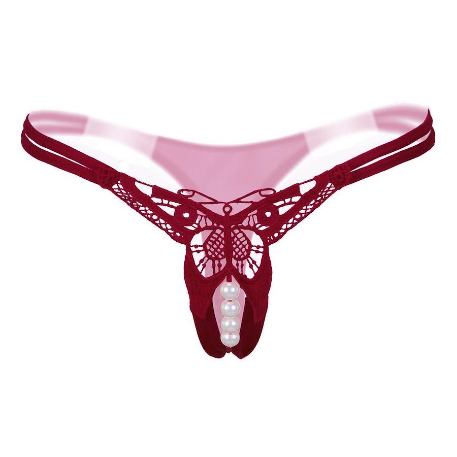 [XuanXuan] クロッチパールショーツ 刺繍 蝶 レース 穴あき Tバック 下着 スケスケ Gストリング カットアウト パンティ セクシー ランジェリー (赤ワイン)