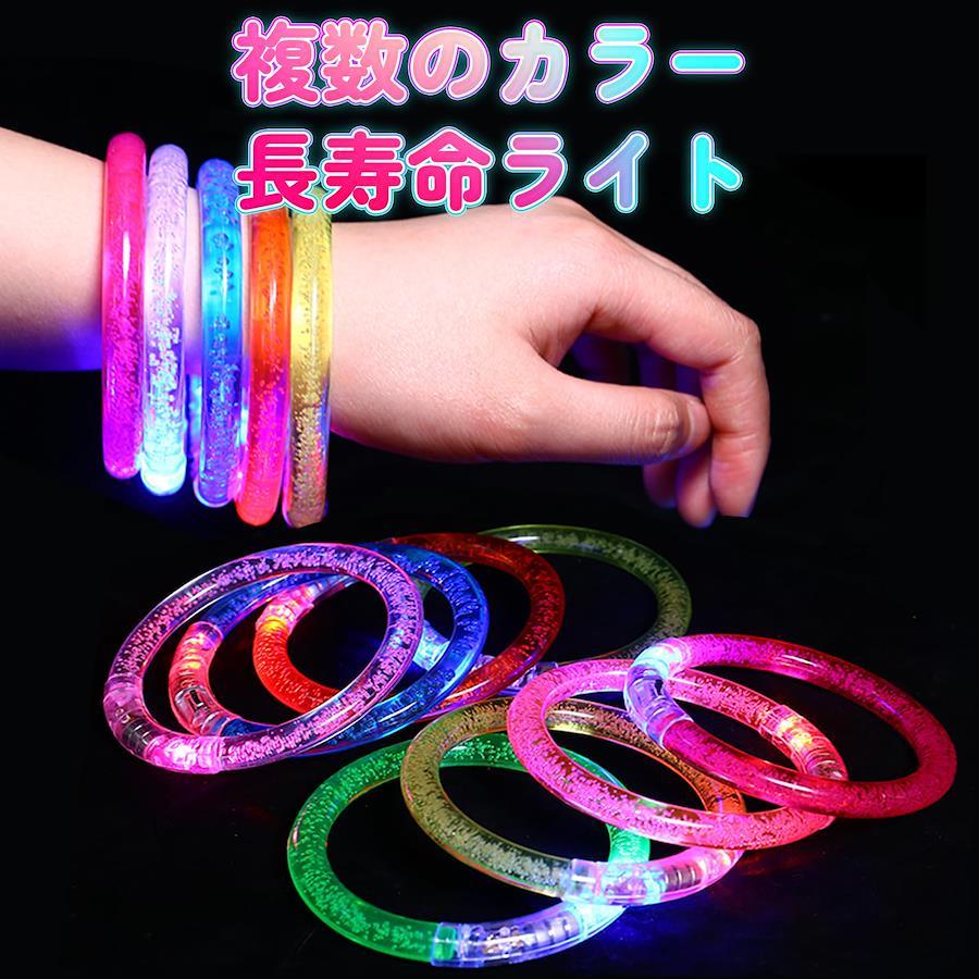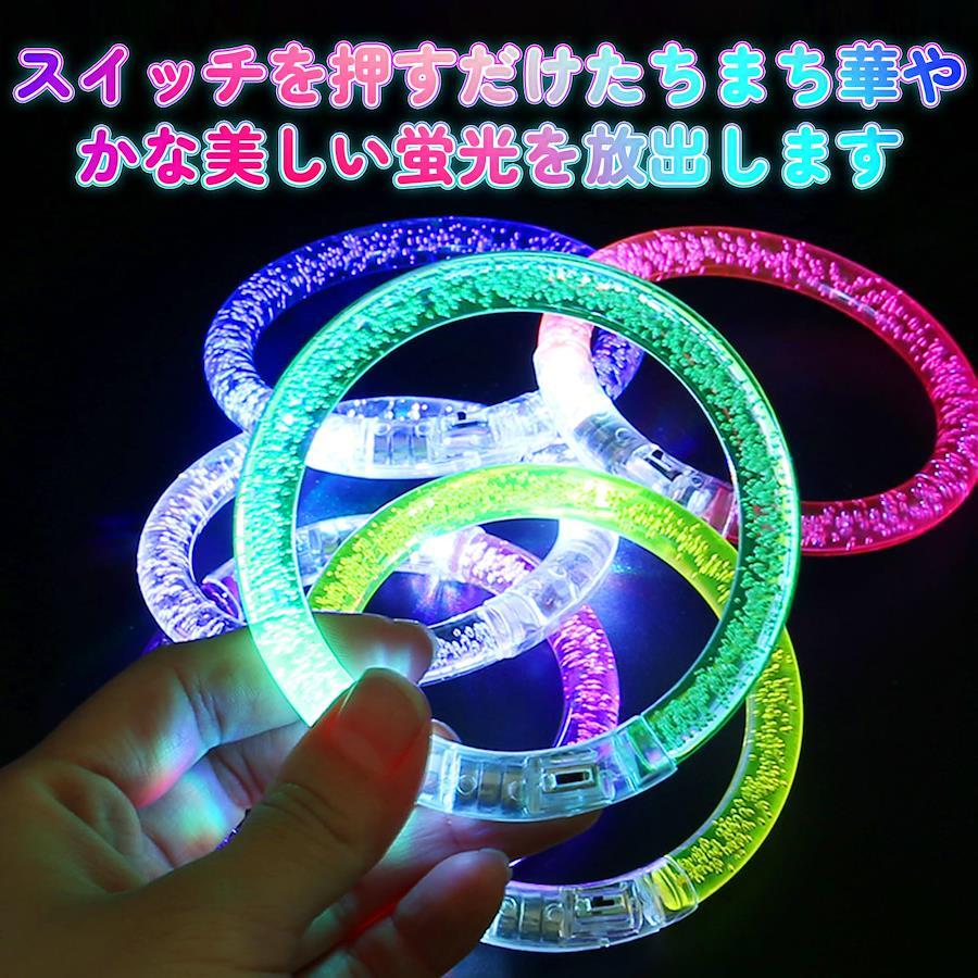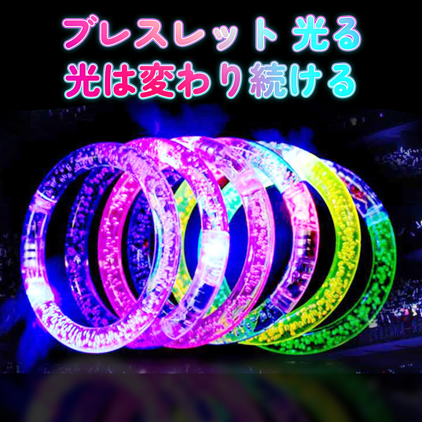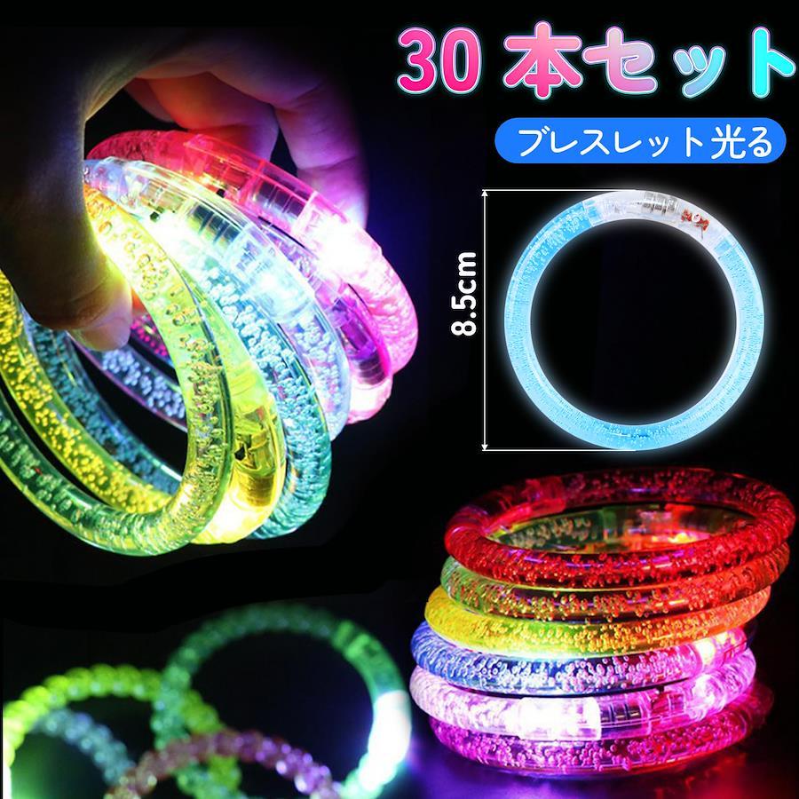 【商品仕様】 光るブレスレット入り数:30本 、接続ジョイント:30個。外径8.4cm 内径6.5cm。バッテリー: ボタン電子機器が付属。※お色、色数などはランダムに入っておりお選びできませんこと、ご了承ください。【多用途な蛍光ブレスレット】スイッチを押すだけたちまち華やかな美しい蛍光を放出します。手首に付けたり、繋ぎ合わせて使わせてもらったり、並べて文字にしたりして、ブレスレットとしてはもちろん、ペンライトやネックレスなどとして活躍します。【発色が明るい】パーティーなどでアピール力を発揮する光るブレスレットで、色の発色が良いです。【きれい♪】パキッと折るだけで、たちまち美しく蛍光に光るケミカルライトです。暗闇の中で明るくキラキラと発光し、きれいに幻想的に光ります。【様々なシーンで活躍】毎年夏祭りやイベントに大人気の光るブレスレットです。祭りはもちろん、ライブ・コンサート・結婚式の二次会・クリスマス・花火・縁日・イベントのグループ分け・文化祭・子ども会・誕生日パーティー・キャンプなど様々なシーンで大活躍しています。ブレスレットとしてはもちろん、ペンライトやネックレスにするのもよし。腕、足につけてもよし!暗い中で光るので迷子防止としても使えます。【免責事項】メーカーによる商品リニューアルに伴いパッケージ(内容量も含む)変更が行われた場合、新パッケージでお届け致します事ご了承願います。