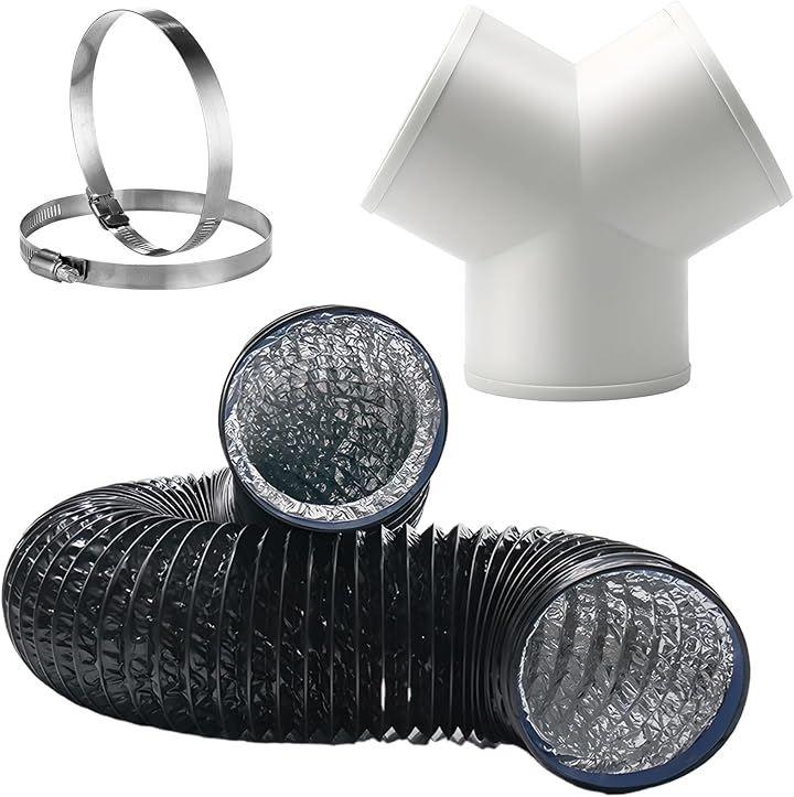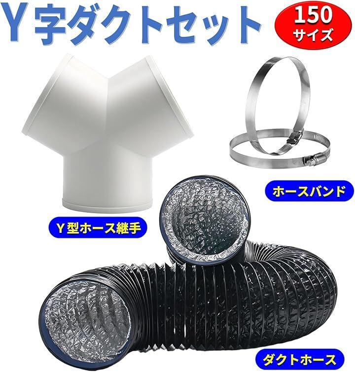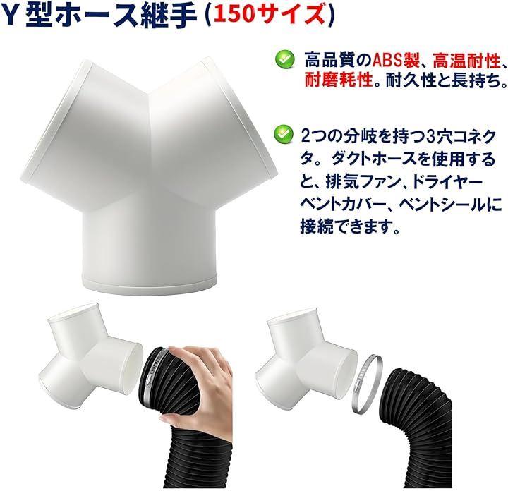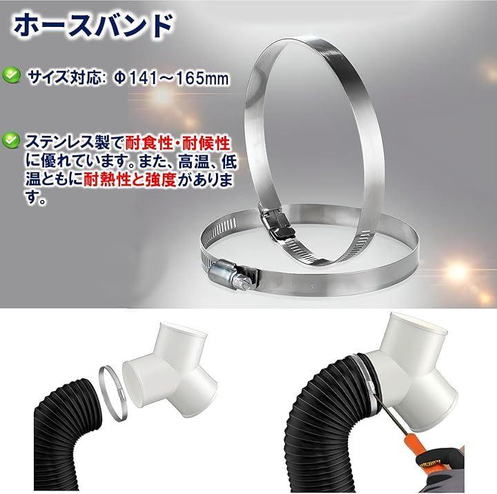 Y型ホース、排気ホース、ホースバンドセット: Y型ホース:パイプ直径145mm、プラスチック、ホワイト、 排気ホース:直径150mmx長さ5m、PVC、アルミ二層構造、ブラック ホースバンド:Φ141~165mmx2個、ステンレス、シルバー *モニターの環境により、色の見え方に若干差が生じる場合がございます。