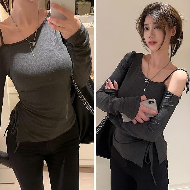 Y2K Women's One-Shoulder Top, Off-the-Shoulder, Long Sleeve T-Shirt, Cut and Slit, Cropped Length, Korean Trend, Asymmetrical, Shoulder Straps