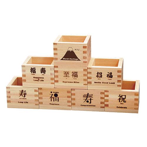 ひのきの香りが清々しい、冷酒にぴったりの枡に、よろこびを寿ぐ文字や図柄を焼印であしらいました。お祝いの品に、海外の方へのお土産にもぴったりです。ロッキング組みがデザイン的アクセントになっています。お酒のほかにも、珍味や前菜の器としてなど、和モダンな使い方で楽しみが広がります。※焼印は手作業で押しますので、濃淡が一定しないことがあります。
