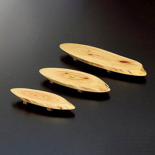 ひのきの丸太(主に間伐材)を斜めに輪切りにした料理皿です。ディスプレイ台としてもお使いいただけます。堅牢で木目が美しい ひのきの特長が見え、ナチュラルで高級感ある演出にお使いいただけます。アクセサリー、陶磁器、硝子器、服飾小物などの陳列にも。小物類の陳列で高さを出す場合にどうぞ。ひのきは強度・耐久性と木目の美しさなどに定評があります。