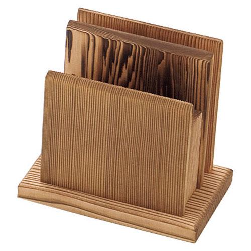 焼杉の木目や風情が特長的な、メニューナプキン立です。情緒を演出したい店舗様に。