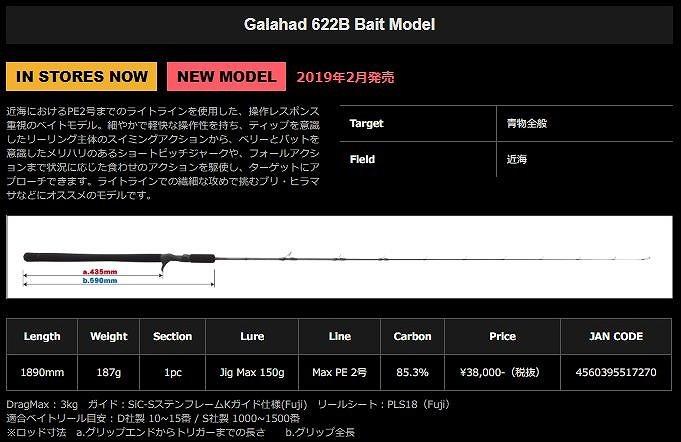 『ギャラハド 622B-ライトラインでの繊細な操作感を実現し、食わせのアクションを多彩に演出するテクニカルモデル』近海におけるPE2号までのライトラインを使用した、操作レスポンス重視のベイトモデル。細やかで軽快な操作性を持ち、ティップを意識したリーリング主体のスイミングアクションから、ベリーとバットを意識したメリハリのあるショートピッチジャークや、フォールアクションまで状況に応じた食わせのアクションを駆使し、ターゲットにアプローチできます。ライトラインでの繊細な攻めで挑むブリ・ヒラマサなどにオススメのモデルです。 全長:1890mm 自重:187g 継数:1ピース ルアー:Max150g ライン:MaxPE2号 カーボン:85.3% グリップ寸法:a.435mm/b.590mm ※a.リール装着時のフット位置からグリップエンドまでの長さ/b.ハンドル全長 ●推奨ターゲット:青物全般 ●特性補足:ドテラ流し&バーチカル対応・シャロー対応 ●推奨水深目安:水深~80m程度まで ●適合リール:D社15/S社1000~1500 ●DragMax:3kg/45°