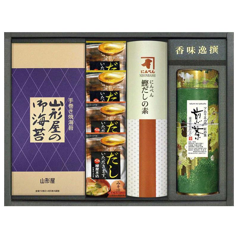 焼海苔半切5枚×4袋、深蒸し上煎茶120g、フリーズドライ味噌汁9.8g×2袋、卵スープ5.4g×2袋、にんべん鰹だしの素6g×8袋