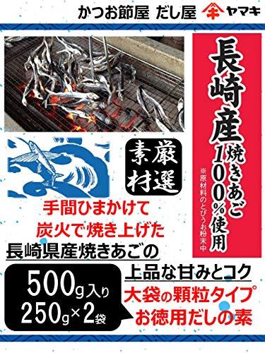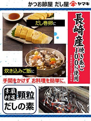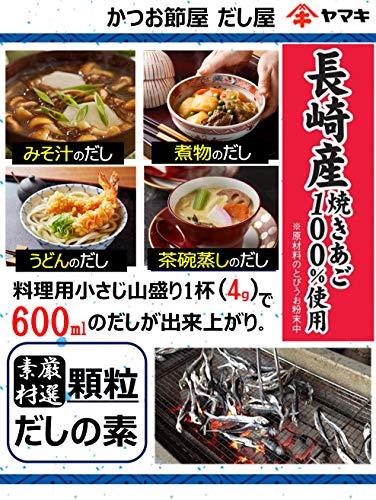 ヤマキ「焼きあごだし」は炭火で丹念に焼き上げた長崎産あご(とびうお)を使用し、焼きあご特有の上品な風味を大切にしただしの素です。ご使用の目安は料理用小さじ山盛り1杯(約4g)あたり、味噌汁、煮物は約4人分(600ml)。鍋物のだしとしては、1000ml~1200ml。めんのかけつゆのおだしとしては、500ml(約2人分)。茶碗蒸しのだしは400ml(約4人分)でお楽しみ下さい。