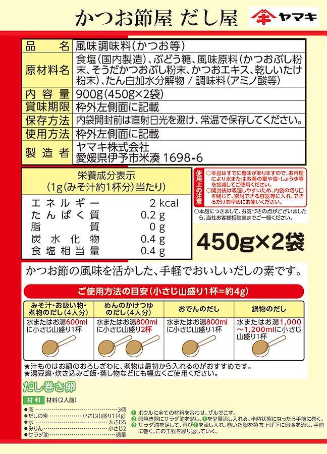 原材料:食塩(国内製造)、ぶどう糖、風味原料(かつおぶし粉末、そうだかつおぶし粉末、かつおエキス、乾しいたけ粉末)、たん白加水分解物、 / 調味料(アミノ酸等)