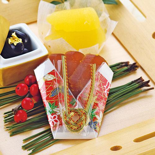 おせちの田作りを揃えて演出する、袋状の熨斗容器です。