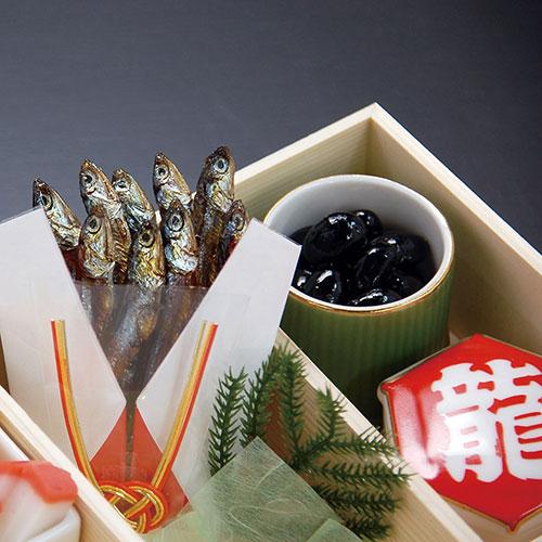 おせちの田作りを揃えて演出する、袋状の熨斗容器です。