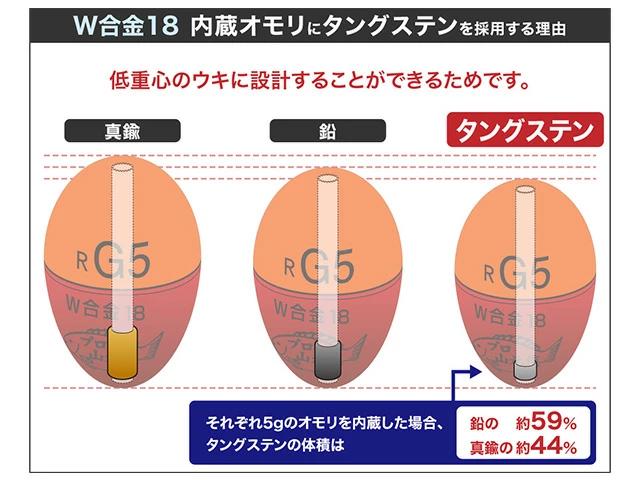 W合金18シリーズは、内蔵オモリにタングステンを使用。タングステンの比重は、鉛の約1.7倍、真鍮に対しては2.3倍も重くなります。同じ浮力・同じ自重のウキでは、比重の大きいタングステンは、体積が小さいため、ウキの最下部に配置することが可能です。これにより、究極の低重心のウキに設計できます。また、ウキ自体のシルエット(体積)も小さくできるため、遠投時に空気抵抗が小さく、驚くほど飛距離がアップ、飛行姿勢も安定します。この抵抗の小ささは海中でも威力を発揮し、喰い込みが大幅にアップします。