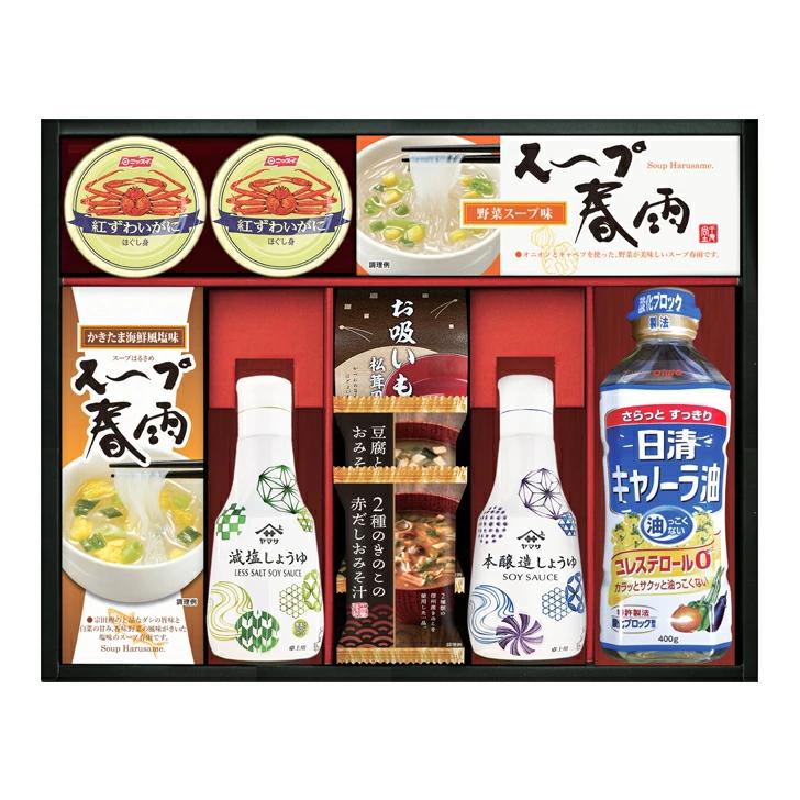 ヤマサ鮮度減塩しょうゆ200ml、スープ春雨かきたま海鮮風塩味(12.9g×2)、スープ春雨野菜スープ味(13.2g×2)、永谷園お吸いもの(2.3g×2)、2種のきのこの赤だしおみそ汁7.1g、とうふと油揚げのおみそ汁9.2g、ヤマサ鮮度しょうゆ200ml、日清キャノーラ油400g×各1、ニッスイ紅ずわいがにほぐし身55g×2