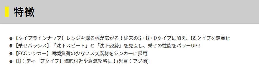 タイプラインナップ:レンジを探る幅が広がる! 従来のS・B・Dタイプに加え、BSタイプを定番化! 乗せバランス「:沈下スピード」と「沈下姿勢」を見直し、乗せの性能をパワーUP! ECOシンカー:環境負荷の少ないスズ素材をシンカーに採用!