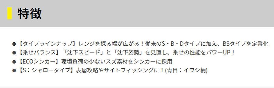 ●【タイプラインナップ】レンジを探る幅が広がる!従来のS・B・Dタイプに加え、BSタイプを定番化。●【乗せバランス】「沈下スピード」と「沈下姿勢」を見直し、乗せの性能をパワーUP!●【ECOシンカー】環境負荷の少ないスズ素材をシンカーに採用。●【S:シャロータイプ】表層攻略やサイトフィッシングに!(青目:イワシ柄)。
