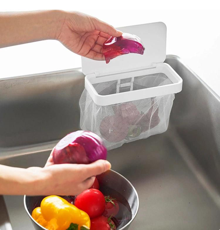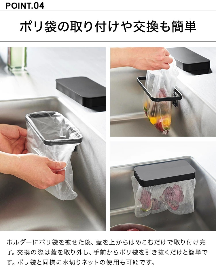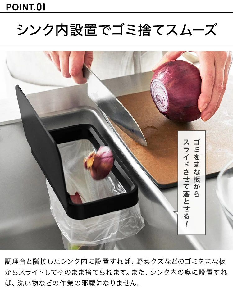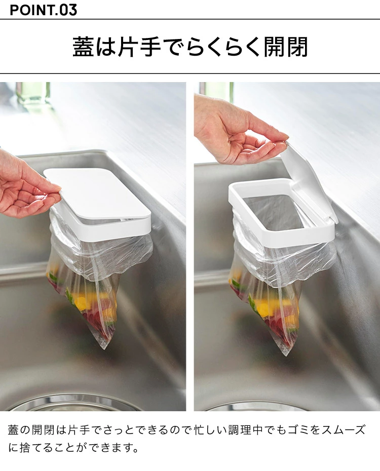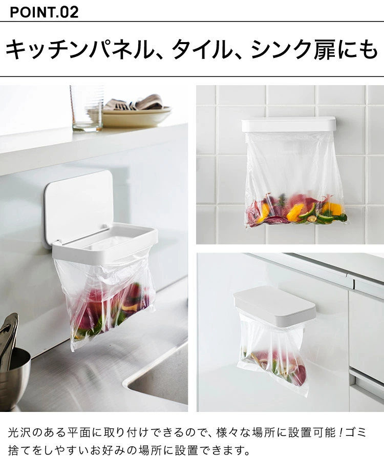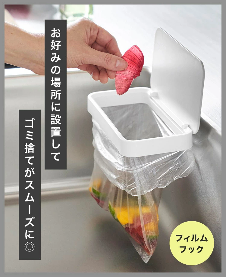 調理スペースのまな板から野菜くずをスライドさせてそのまま捨てられる!貼り付けたフィルムフックに掛けるだけの簡単設置。蓋は片手で簡単に開閉でき、お好みの向きに取り付け可能です。使用時以外、蓋を閉めることでキッチンが清潔に保てます。蓋は簡単に取り外しが可能なので、ポリ袋や水切りネットが楽に交換できます。光沢のあるシンク扉やタイル、キッチンパネルなどに浮かせて設置できます。