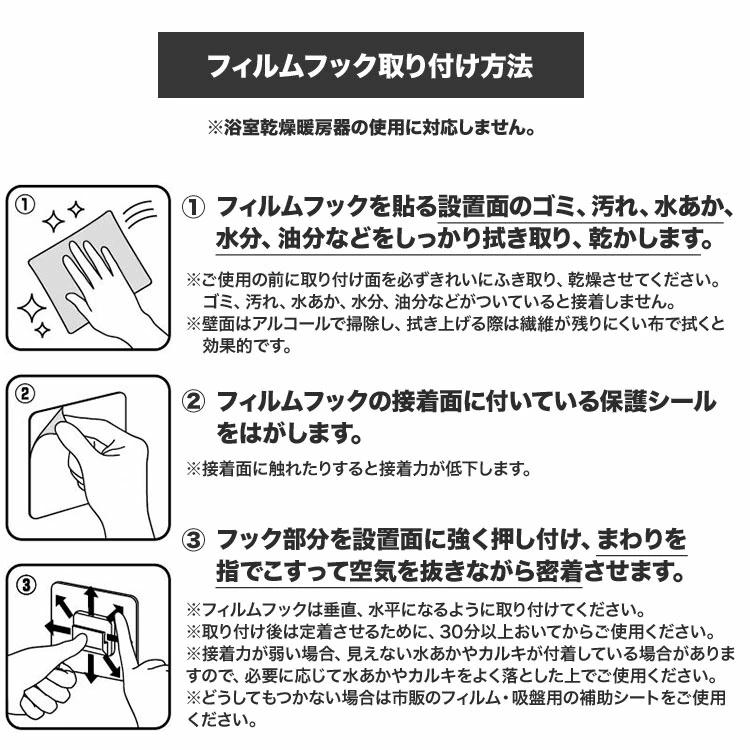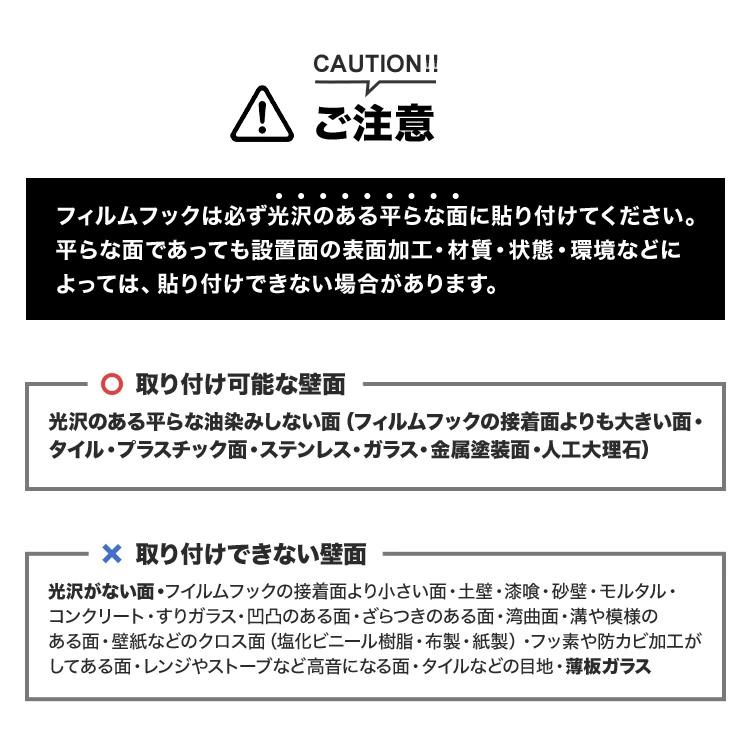 光沢のある平らな油染みしない面で、フィルムフックの接着面よりも大きい面(タイル・プラスチック・ステンレス・ガラス・金属塗装面・人工大理石)