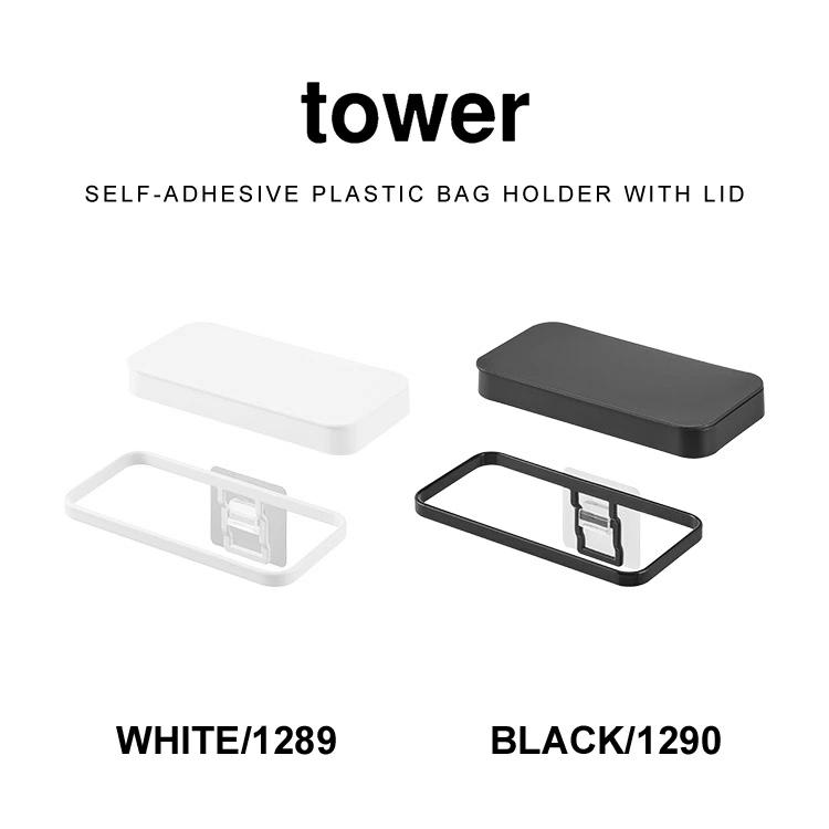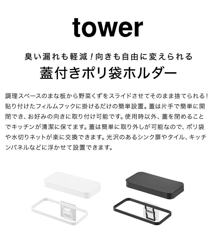 山崎実業 フィルムフック蓋付きポリ袋ホルダー タワー 1289 1290 tower 生ゴミ ゴミ箱 小さい フタ付き ホルダー シンク内 壁掛け キッチンパネル タイル シンク扉 ダストボックス おしゃれ 浮かせる 壁面収納 省スペース くずかご 衛生的 台所 便利 グッズ コンパクト 薄型 かけるだけ ゴミ袋ホルダー 臭い漏れ 防止 ホワイト ブラック スリム シンプル 白 黒 生ゴミ入れ ミニサイズ 蓋つき シンク周り 流し台 三角コーナー 片手 開閉 新生活 yamazaki ふたつき スタイリッシュ ダストポケット