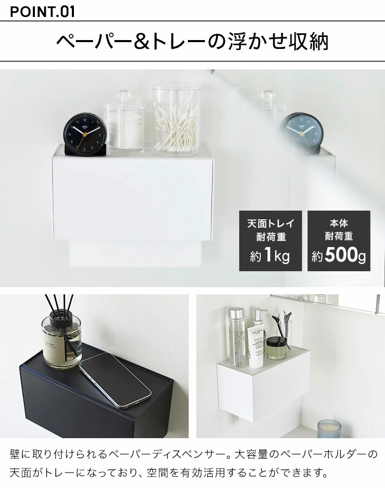 【トレー付きペーパータオルディスペンサー】洗面所やトイレに簡単取り付け!シンプルでスタイリッシュなデザインなので場所を選ばずスマートに設置できるペーパータオルディスペンサーです。上面はトレーになっているので小物やスマートフォンなどの一時置きにも便利。補充の際は前面の蓋を開けるだけ。ペーパータオル・キッチンペーパー・ティッシュペーパーのボックスやソフトタイプにも対応。木ネジの他、壁の穴が目立ちにくい石こうボードピンで、工具や強い力の必要なく簡単に壁に取り付けられます。