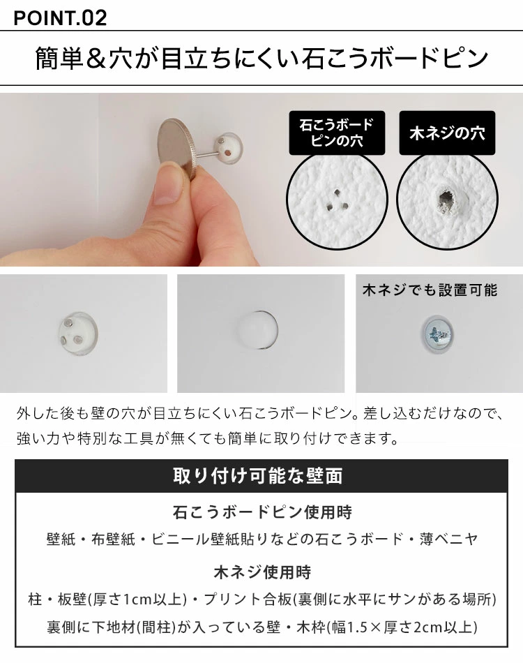 ■対応壁素材石こうボードピン使用時:壁紙・布壁紙・ビニール壁紙貼りなどの石こうボード・薄ベニヤ木ネジ使用時:柱・板壁(厚さ1cm以上)・プリント合板(裏側に水平にサンがある場所)裏側に下地材(間柱)が入っている壁・木枠(幅1.5×厚さ2cm以上)
