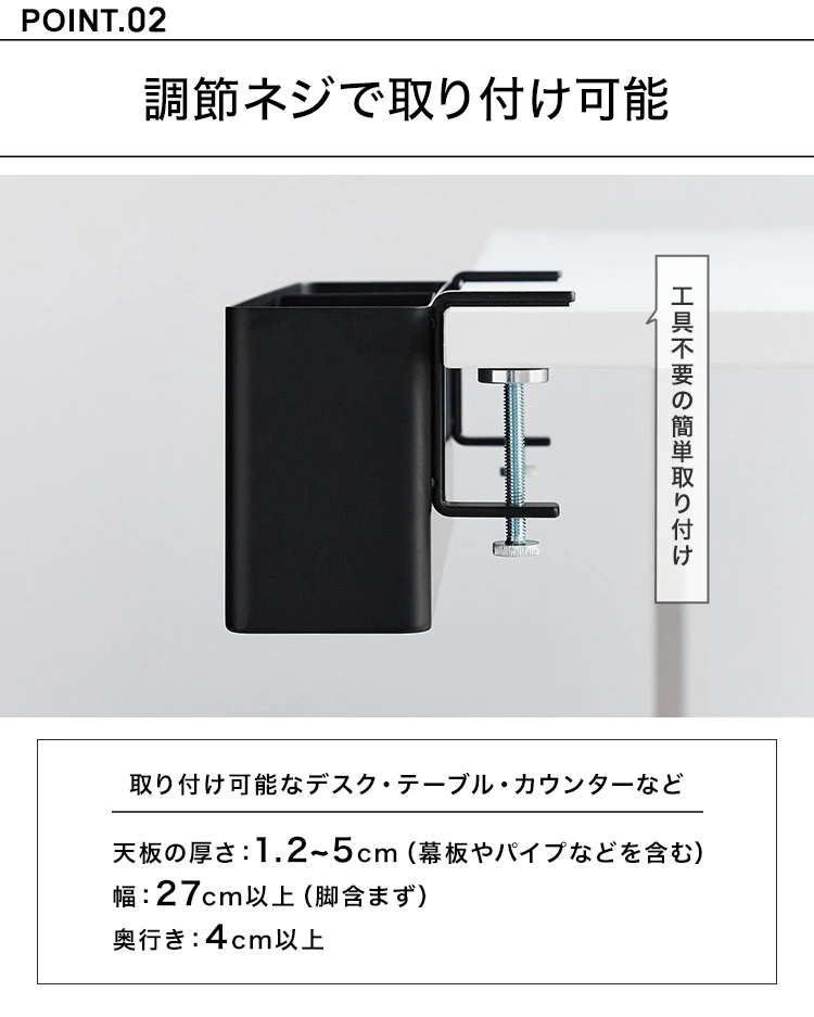■取り付け可能な天板天板の厚さが1.2~5cm(幕板やパイプなど含む)幅28cm以上(脚含まず)奥行き4cm以上のデスク・テーブル・キッチンカウンターなど※設置する部分の構造によっては取り付けできない場合があります。