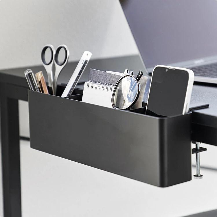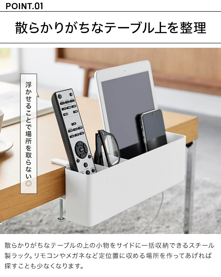 【テーブル横リモコンラック】調節ネジで簡単取り付け。テーブルやデスク上を広く使えるリモコンラック。散らかりがちなリモコンやメガネ、タブレット端末、ゲーム機などを収納できるのでテーブルを広々使用できます。ケーブルを通せるので充電しながら収納することもできます。ダイニングでは、調味料をまとめて収納できて便利。デスク横に取り付けて、散らかりがちな文房具などの収納にも。マグネット仕切り板は可動式で自由に仕切ることができます。調節ネジで簡単設置。天板の厚さ1.2cmから5cmに対応。